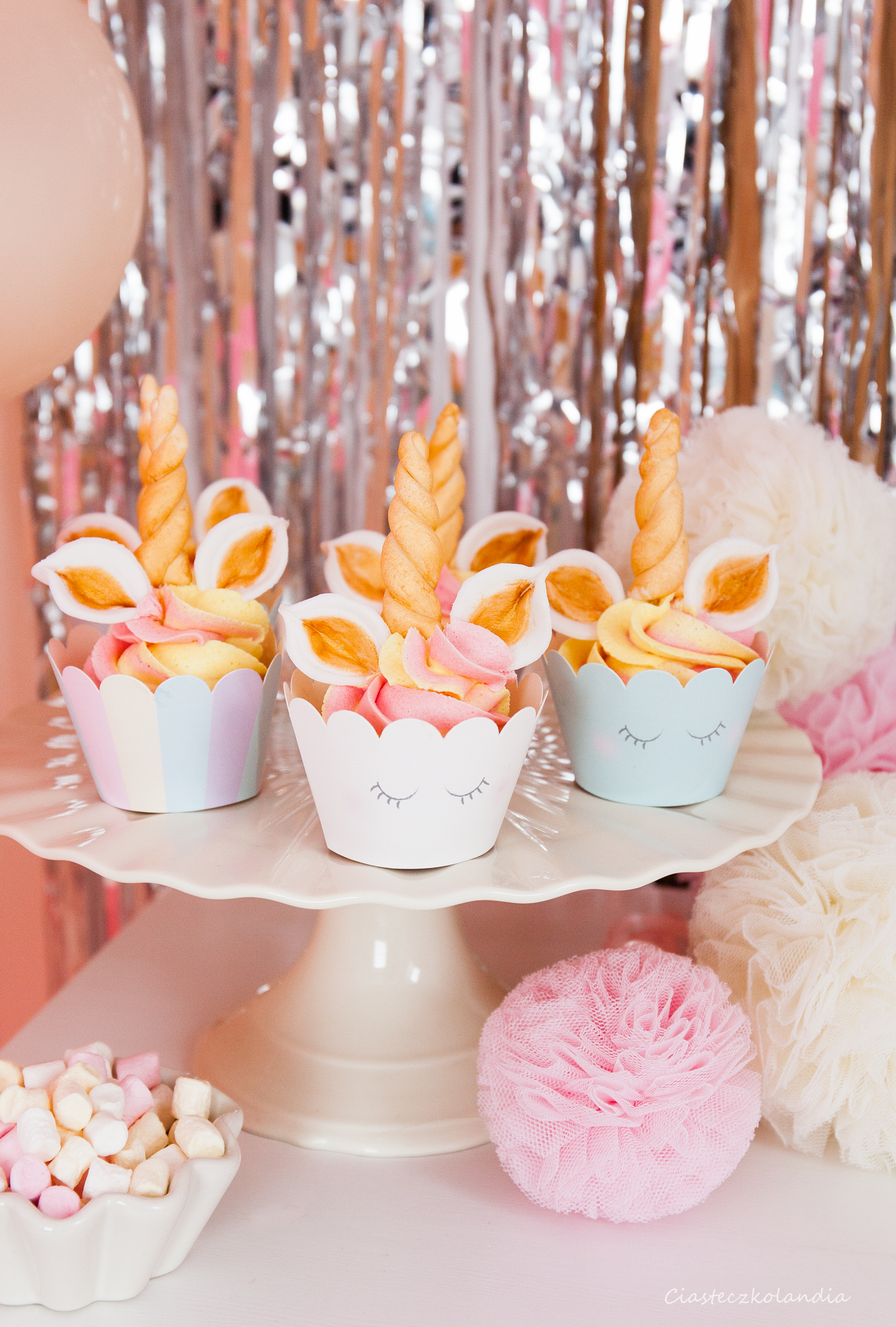 Babeczki jednorożce, idealne na imprezę w stylu ,,unicorn party”(naszą możecie podejrzeć tutaj: (klik)). Z dwukolorowym kremem, choć w tej kwestii nie ma limitu, trójkolorowe byłyby jeszcze bardziej tęczowe i ładne. Wywołują zachwyt dzieci, a jeśli wbijemy w nie świeczki, z powodzeniem mogą zastąpić tort (bo, jeśli to impreza przedszkolaków, uprzedzam, że dzieci raczej nie zjedzą jednego i drugiego).