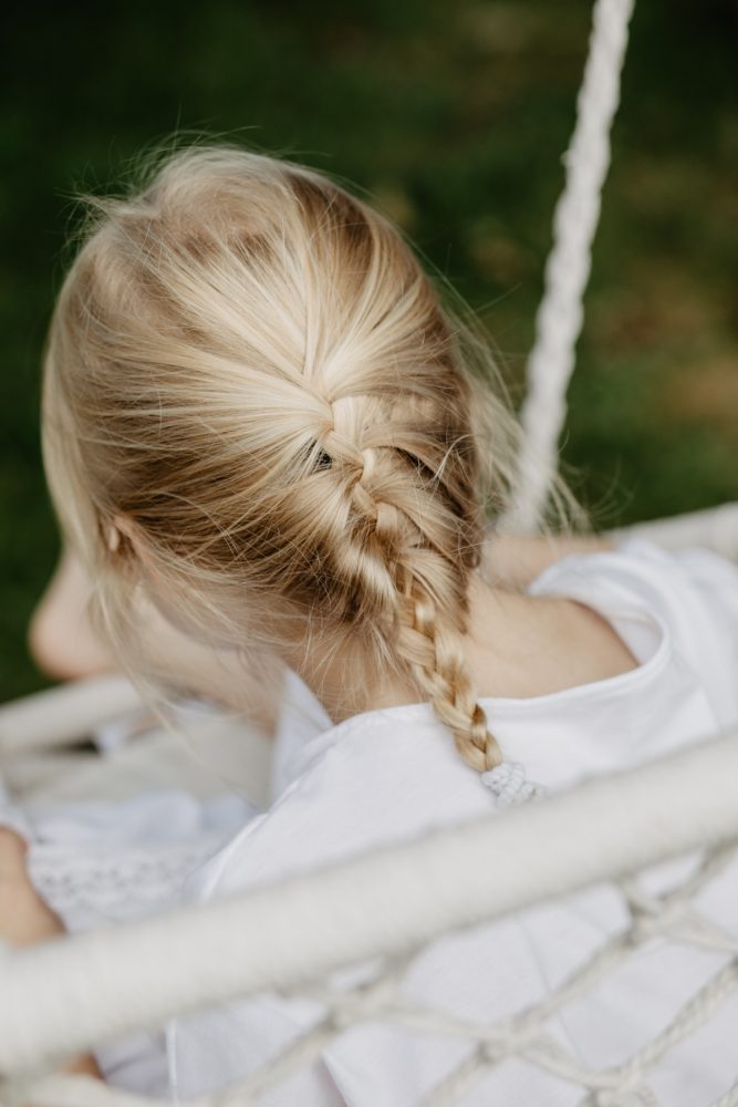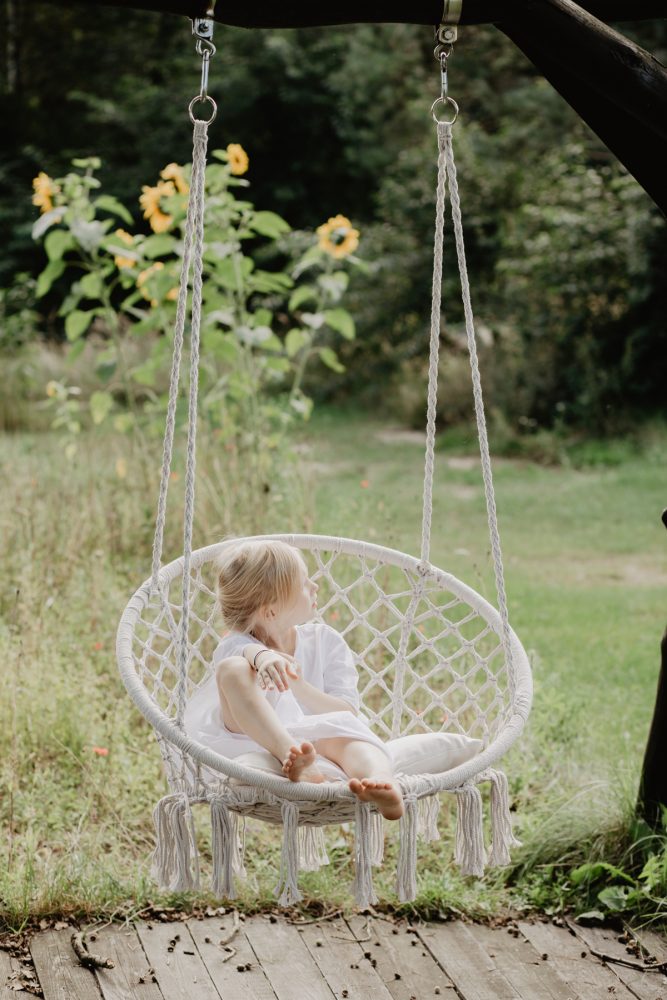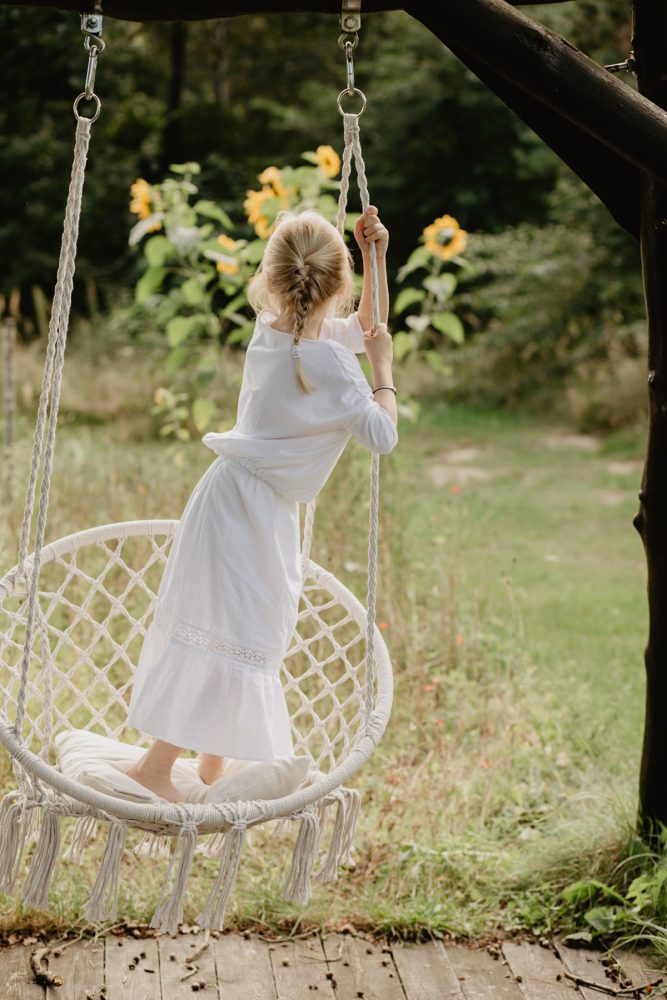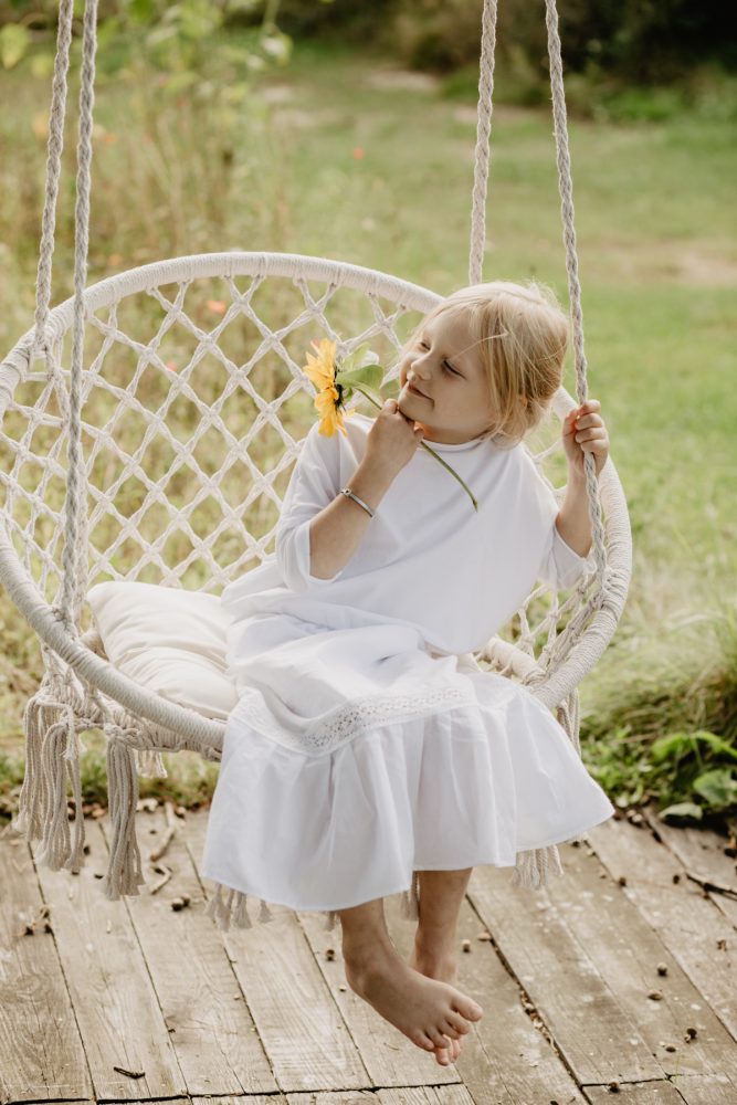 Tak właściwie, to nie było żadnego powodu, by te zdjęcia powstały. Miałyśmy co prawda zrobić kilka ujęć dla dziewczyn z Bohemian youngster, ale nie tego dnia, i nie na bloga. Kiedy jednak po powrocie z przedszkola, Małgosia przebrała się w ten biały komplet i zaczęła huśtać boso na huśtawce hamakowej, poczułam, że powinnam sięgnąć po aparat…