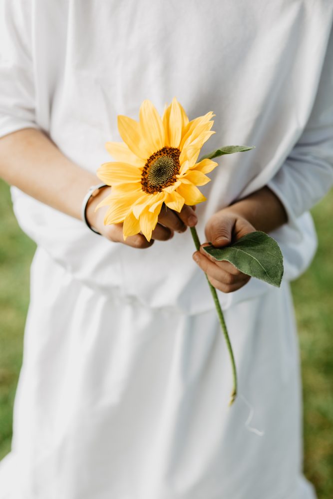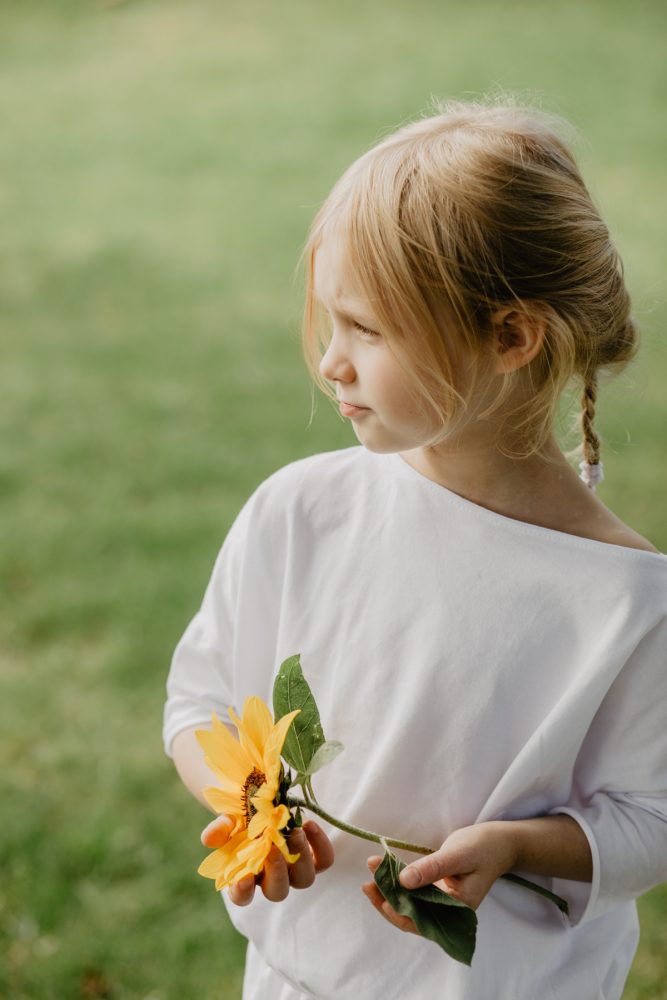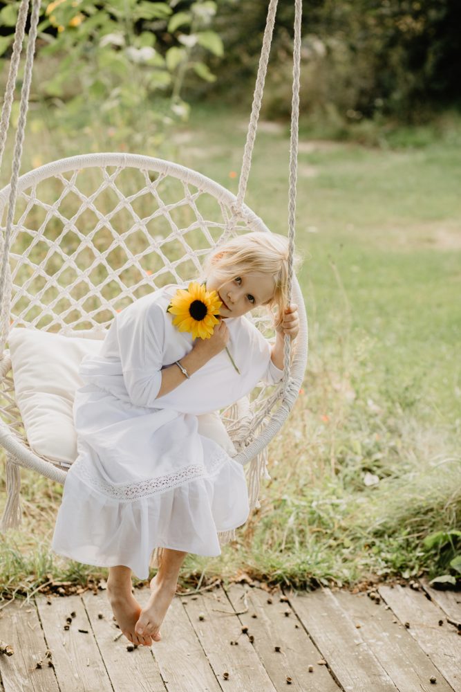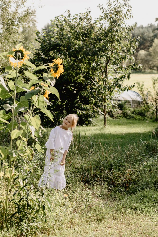 Ale też, czy szczególne okazje i preteksty są do zrobienia sesji zdjęcowej potrzebne? Czy nie wystarczającym powodem są ostatnie, ciepłe wrześniowe dni? Pierwsze żołędzie na deskach pod huśtawką? Słońce, które już niżej na niebie osiada, niż jeszcze tydzień temu? Czy sama świadomość, że kiedy następnym razem te bose stópki będą biegały po trawie, będą już rozmiar większe, rączki pomieszczą więcej kwiatuszków, a słoneczniki w ogrodzie będą dla niej ciut niższe, nie powinny być wręcz mobilizacją, by je zrobić…?