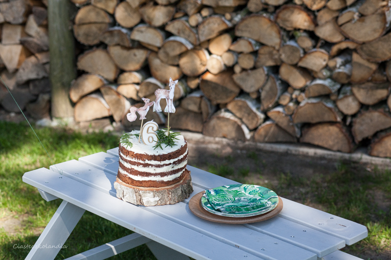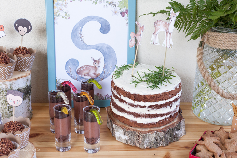 Tort. Najprostszy z prostych, tzw, naked cake (goły tort) szalenie mody ostatnio (nawet jedliśmy go ostatnio na weselu) i bardzo dobrze, bo proste rzeczy są najpiękniejsze uważam. Postawiłam na biszkopt kakaowy, bo jakoś mi tak do drewna i lasu bardzie pasował. Przełożony bitą śmietana z odrobiną esencji waniliowej i tyle. Każda mama organizująca kinderball, będzie szczęśliwa, mogąc upiec tak prosty tort, bez cudowania z kremami, barwnikami i zabawa z rękawem cukierniczym.