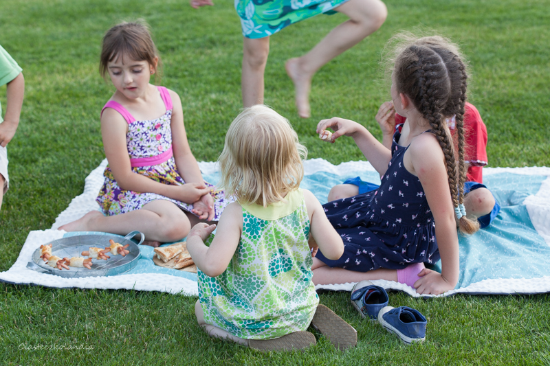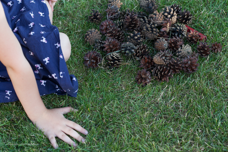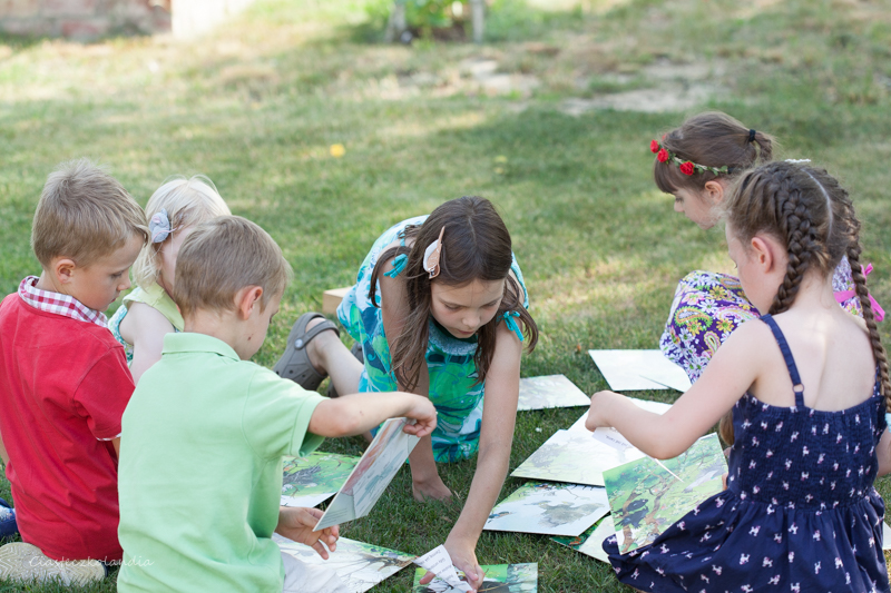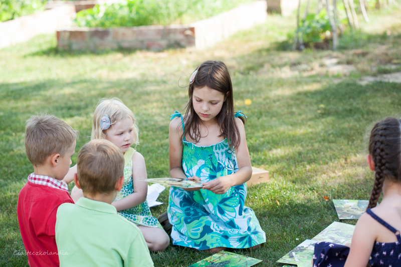 Urodziny zaplanowałam na ogródku i dzięki sprzyjającej aurze udało się je tam w całości zorganizować. Maja, jako starsza siostra solenizanta, odciążyła mnie z zabaw edukacyjnych i ogarnęła świetnie te kwestie. Dzieci opowiadając na jej (przygotowane wcześniej) przyrodnicze, rymowane zagadki zbierały elementy układanki, którą następnie ułożyły i odszukały ukryty skarb. Pan Tata jest mistrzem zabaw ruchowych, więc zajął się tymi sprawami, choć przy jego kolejnym ,,Super, a teraz biegnijcie do mamy po nagrody” w przerażeniu zbierałam myśli, czy coś dla nich jeszcze mam w zanadrzu. Z tego miejsca muszę przyznać, że byłam pod wrażeniem zawodów w zbieraniu szyszek na czas. Zapytałam nawet, czy kolejną zabawą będzie plewienie… 😉