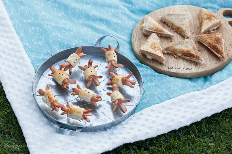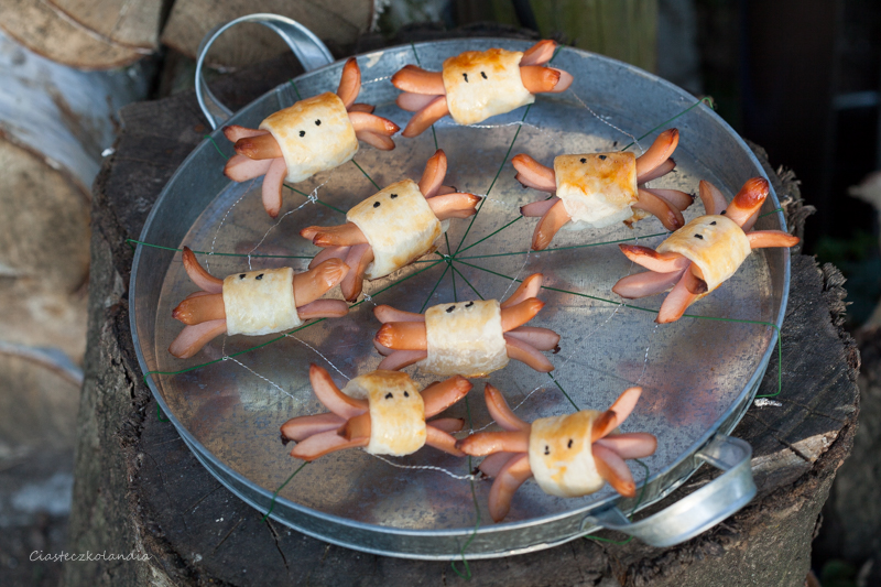 Podane na kolację paróweczki-pająki wywołały również mnóstwo śmiechów i chichów, choć zadanie stworzenia z pomocą drucika pajęczyny na talerzyku jakoś męża mego w euforie nie wprawiło… Do nich tosty z ciągnącą się mozarellą i kolacja zniknęła w mig. Opis przygotowania parówkowych pająków znajdziecie na blogu tutaj (klik)