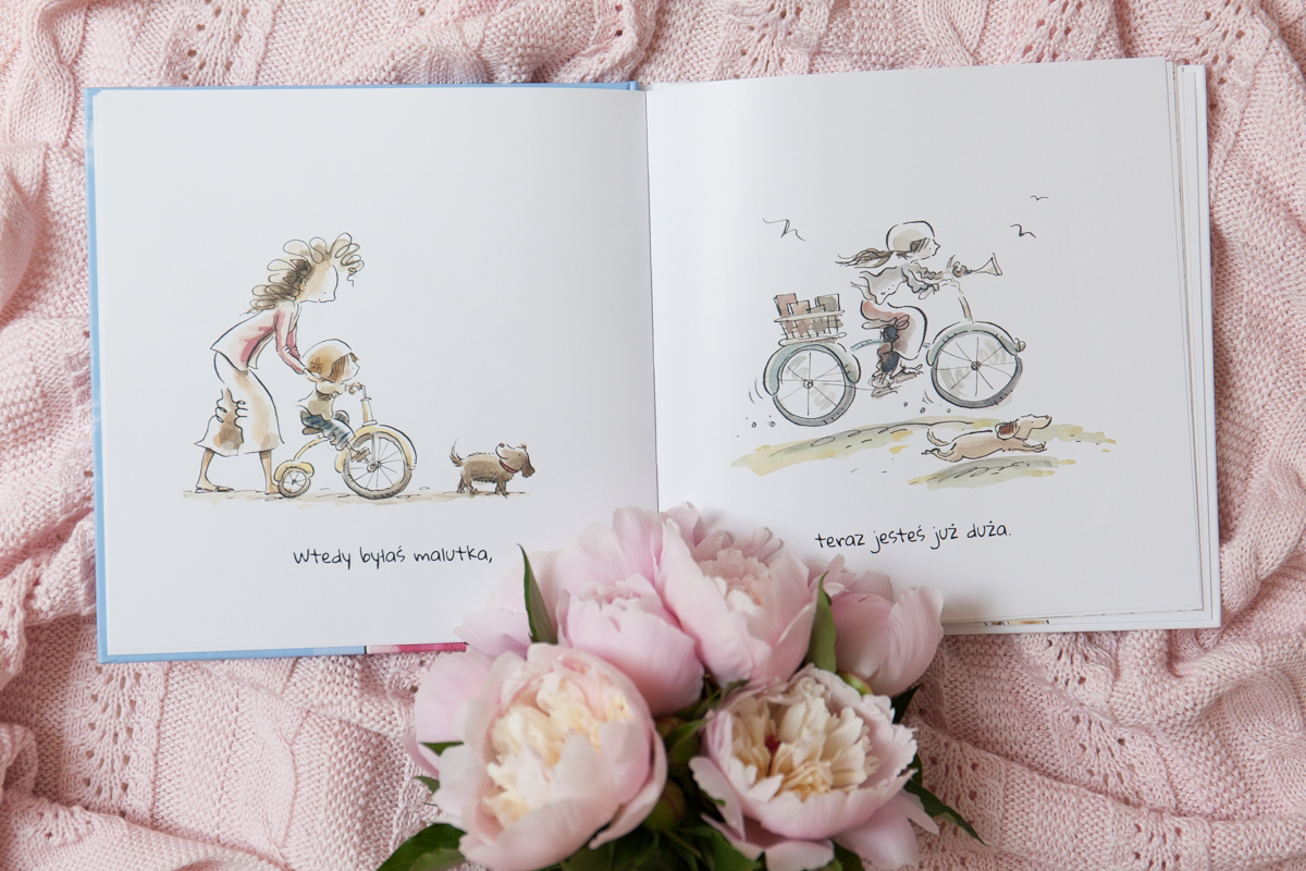 Zwykle robiąc takie przeglądy, książki przedstawiam w przypadkowej kolejności, dziś jednak zacznę o tej moim zdaniem najpiękniejszej…To książka, która jest wyznaniem matki do córki. Ukazuje ulotność macierzyństwa i koło które się na tym obszarze zatacza. Opowieść o ulotnych momentach, które budują wspomnienia. O zwyczajnych, codziennych czynnościach tworzących więź na całe życie między mamą a córką. Nie chce tu pokazać za dużo na zdjęciach, bo bardzo bym sobie życzyła, by każda mama pewnego dnia sprezentowała ją swojej córce. Moja Majeczka dostanie ją dziś ode mnie na swoje dziesiąte urodziny, ale równie mocno chciałabym jej ją sprezentować na osiemnaste, lub gdy będzie wyjeżdżać z domu na studia, czy sama zostanie mamą . Absolutny majstersztyk i wyciskacz łez. Ogromna dawna wzruszenia zaklęta na kilkunastu kartkach. Jeśli jesteście mamami córek, nie zastanawiajcie ani minuty, czy wasze córki powinny ją mieć. Ani minuty…